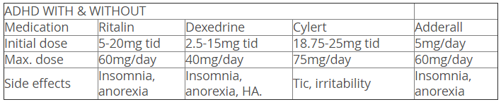 | Medication | Ritalin | Dexedrine | Cylert | Adderall |