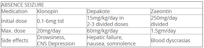 Absence Seizures are being treated effectively with Valproic Acid, which is the drug of choice, but Clonazepam, and Carbamazepine has also been used successfully.